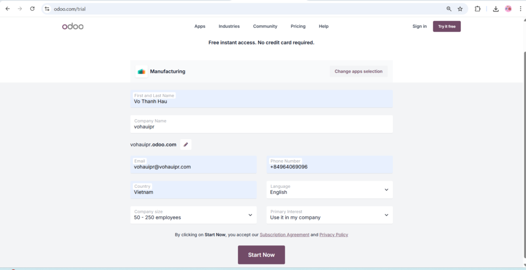 Truy cập odoo.com/trial để bắt đầu. Tại đây, bạn chọn ứng dụng muốn trải nghiệm đầu tiên (ví dụ: Manufacturing). Điền đầy đủ thông tin bao gồm: