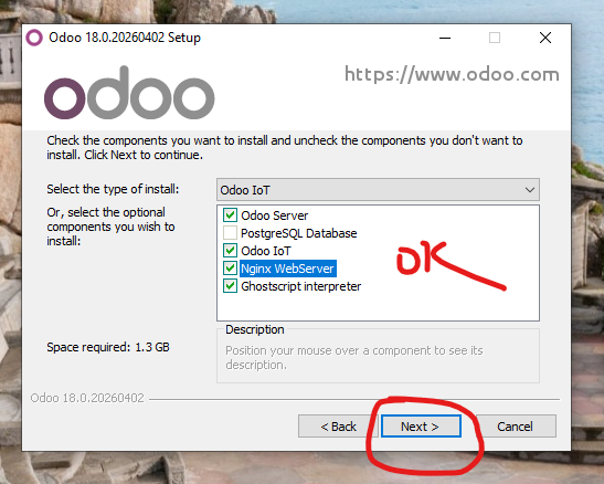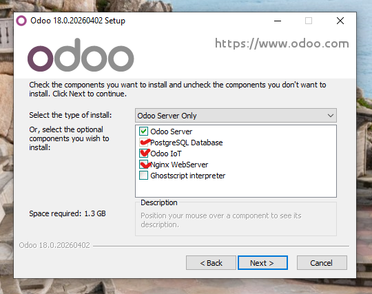 Trong bảng chọn thành phần, hãy tích chọn cả Odoo ServerPostgreSQL Database.