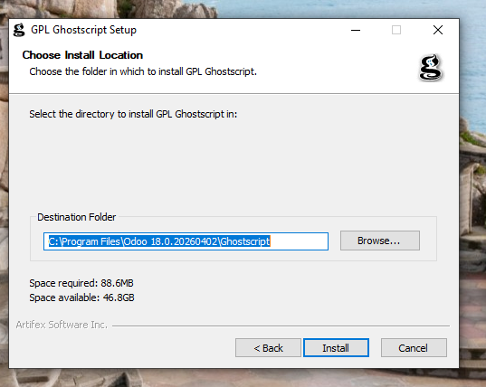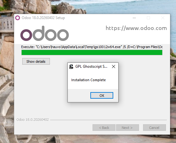 Odoo sử dụng Ghostscript để xử lý các tệp tin PDF và kết xuất báo cáo hình ảnh. Trong quá trình setup, trình cài đặt sẽ yêu cầu cài đặt thêm thành phần này. Bạn chỉ cần nhấn “I Agree” và làm theo các bước mặc định để hoàn tất.