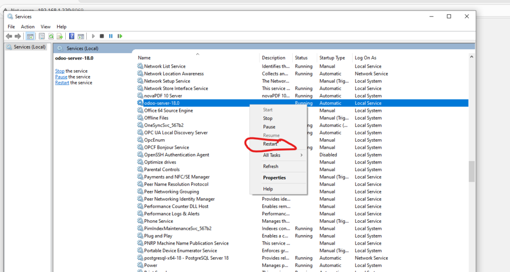 Mở bảng điều khiển dịch vụ của Windows (Services.msc) để đảm bảo trạng thái của Odoo Server“Running”. Khi mọi thứ đã sẵn sàng, bạn truy cập vào địa chỉ localhost:8069 trên trình duyệt để bắt đầu xây dựng quy trình vận hành cho doanh nghiệp.