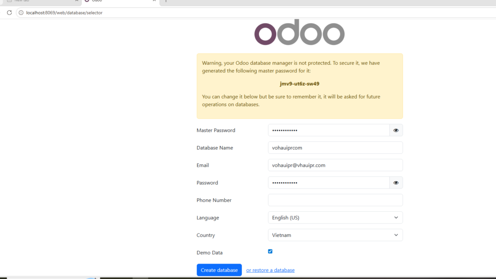 • Tên công ty: vohauipr (Tên này sẽ trở thành subdomain của bạn: vohauipr.odoo.com).