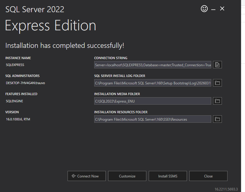 SQL2022-SSEI-Expr, bạn nhấn chuột phải và chọn Run as administrator để đảm bảo quá trình cài đặt không bị gián đoạn bởi quyền truy cập hệ thống. - Hoàn tất cài đặt: Sau khi quá trình chạy kết thúc, màn hình sẽ hiển thị thông báo “Installation has completed successfully!”. Tại đây, bạn cần lưu ý các thông tin như Instance Name (mặc định thường là