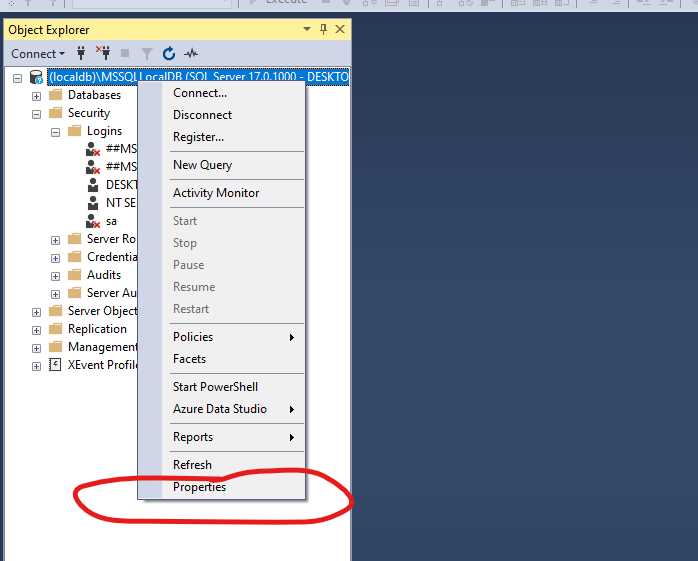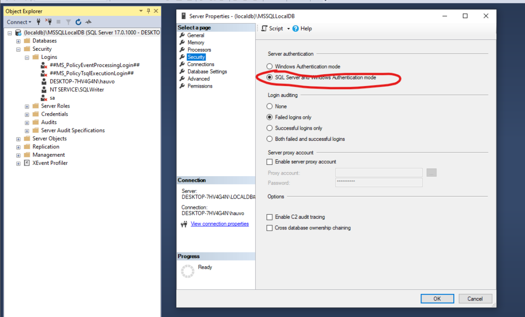 (localdb)\MSSQLLocalDBhoặc tên máy của bạn) và chọn Properties. - Cấu hình Security: Trong cửa sổ Server Properties, chọn trang Security.