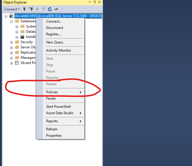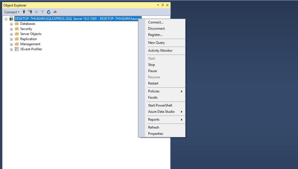 - Thực hiện Restart: Trong giao diện SSMS, nhấn chuột phải vào tên Server ở trên cùng của cây thư mục (Object Explorer).