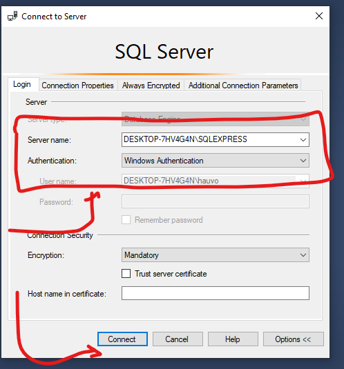 - Authentication: Chuyển từ Windows Authentication sang SQL Server Authentication.