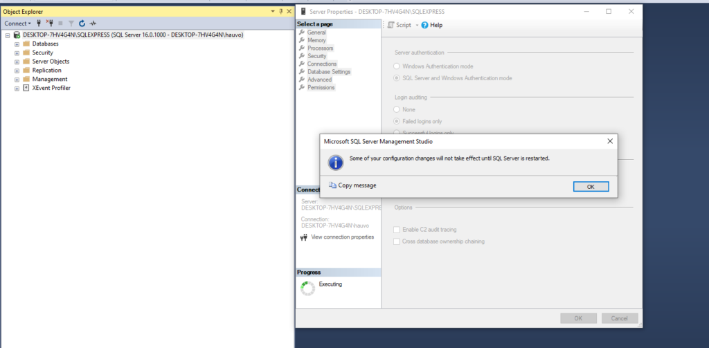 Lưu ý quan trọng: Hệ thống sẽ thông báo rằng thay đổi này chỉ có hiệu lực sau khi bạn khởi động lại (restart) SQL Server.