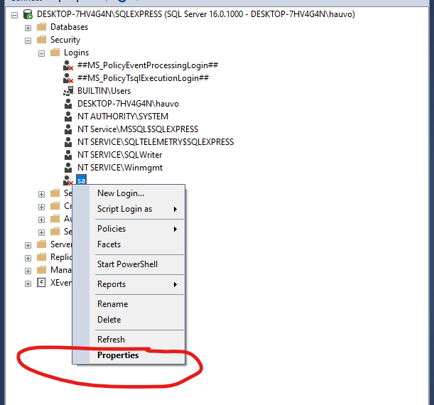 sa(thường có biểu tượng mũi tên đỏ chỉ xuống nghĩa là đang bị khóa) và chọn Properties. - Đặt mật khẩu: Tại trang General, hãy nhập mật khẩu mới tại ô Password và Confirm password.