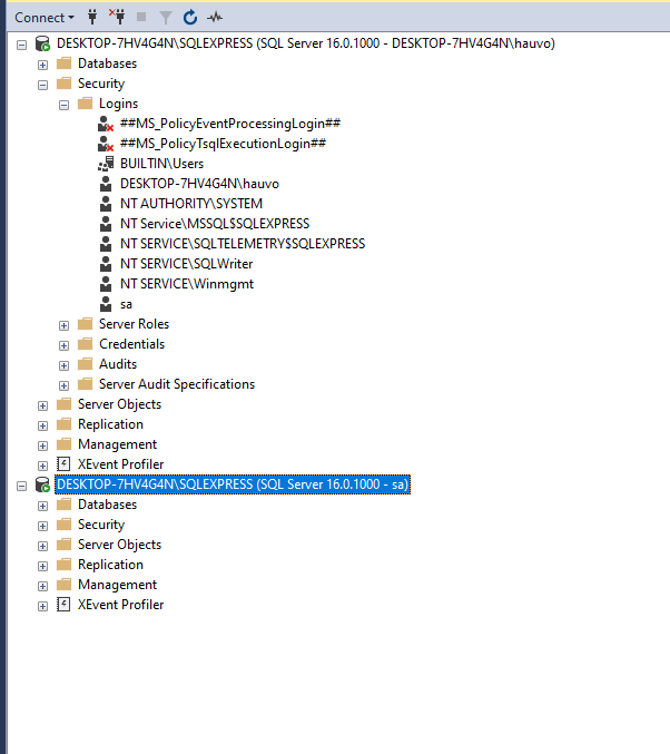 - Tìm tài khoản sa: Trong cửa sổ Object Explorer, tìm đến mục Security > Logins.