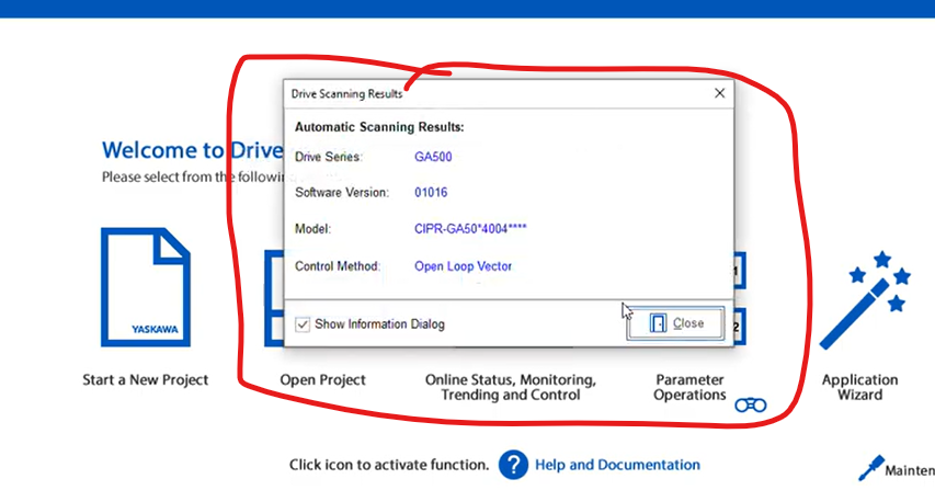 • Cửa sổ Automatic Scanning Results sẽ hiện ra với đầy đủ thông số định danh của biến tần. Nhấn Close.