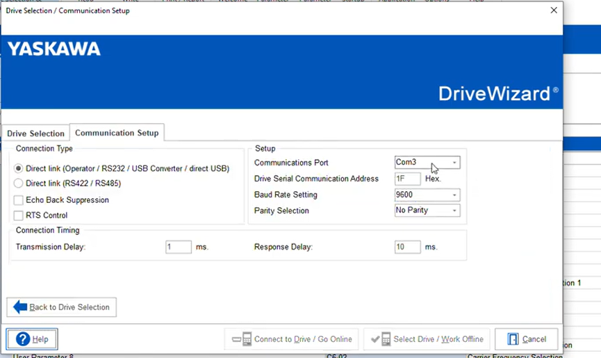 • Trong phần mềm DriveWizard, chọn tab Communication Setup.