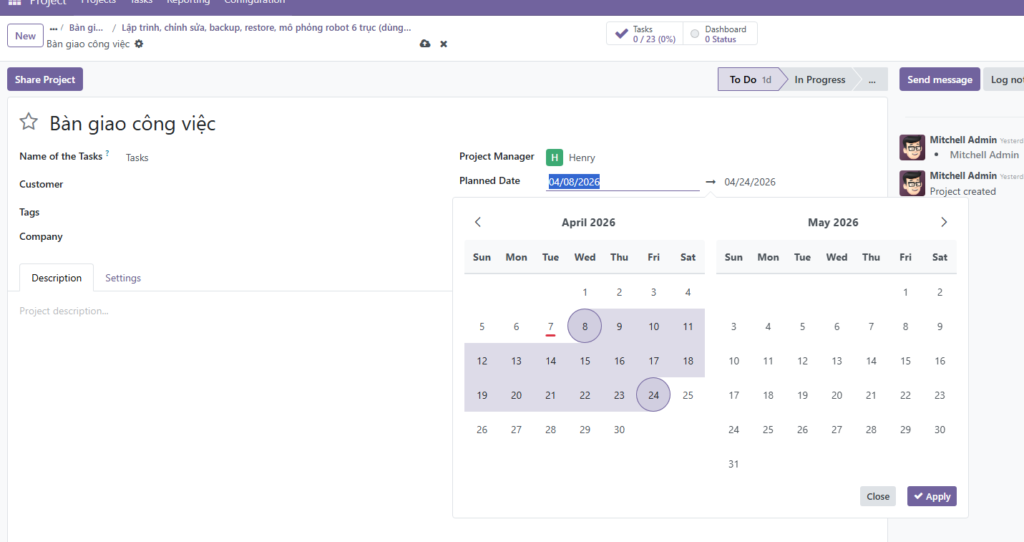 - Sử dụng trình thả lịch để chọn ngày bắt đầu và ngày kết thúc (ví dụ: từ 08/04 đến 24/04). Việc này giúp hệ thống tính toán được thời lượng dự kiến cho toàn bộ dự án.