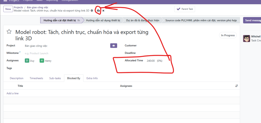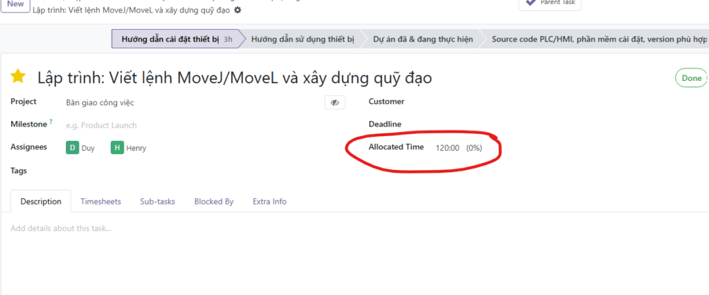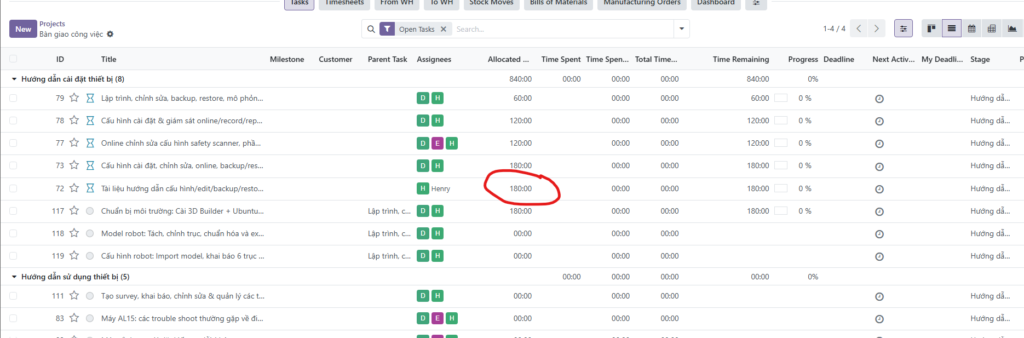 - Tại Task cha: Nhập số giờ dự kiến vào ô Allocated Time (ví dụ: 180:00).