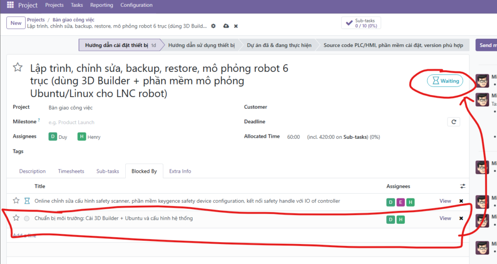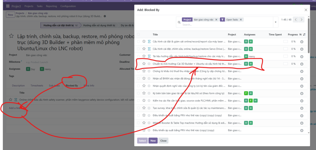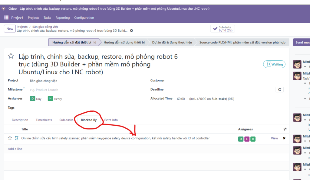 Trong kỹ thuật, bước A chưa xong thì không thể làm bước B. Odoo giải quyết việc này bằng tính năng Blocked By.