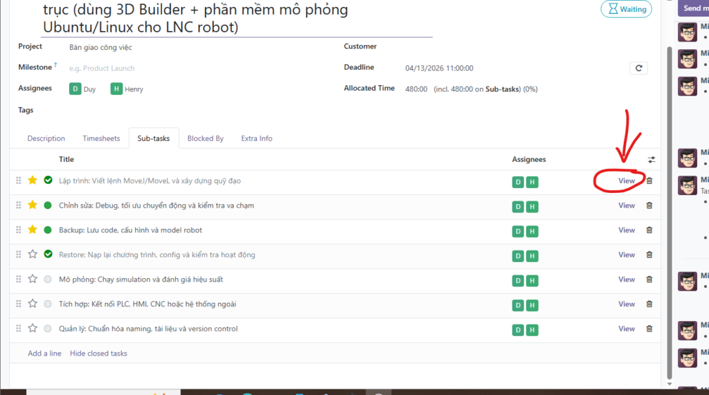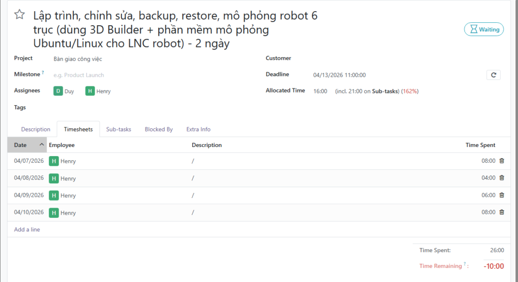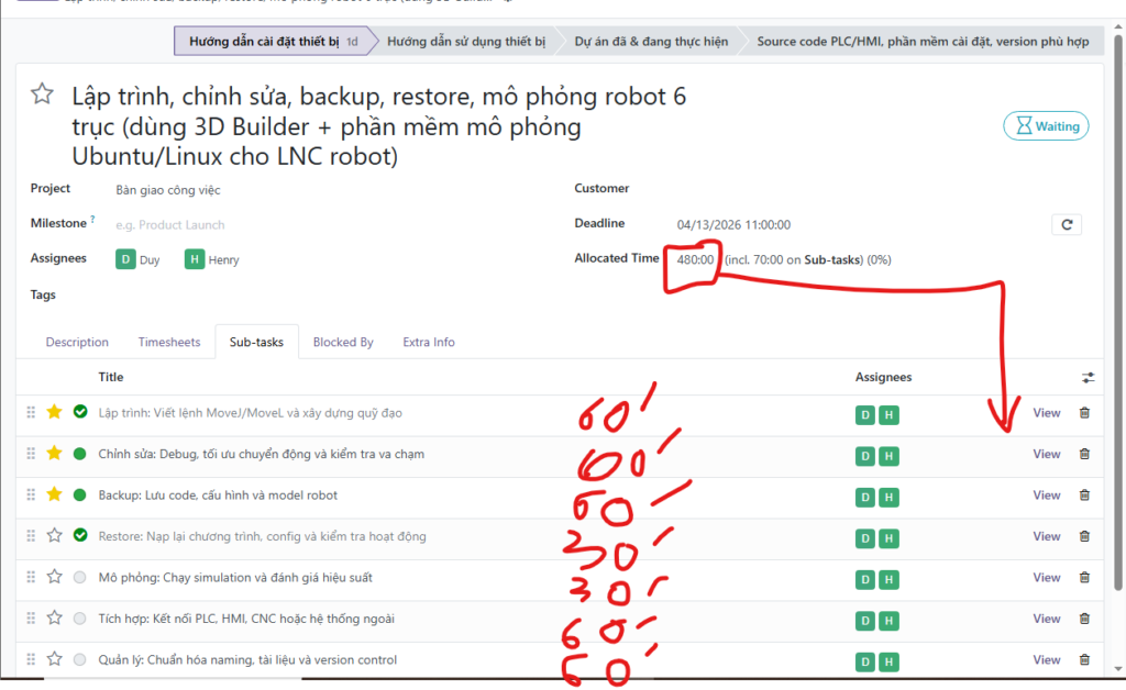 - Tại Sub-task: Chia nhỏ thời gian cho từng hạng mục kỹ thuật (như Viết lệnh MoveJ/MoveL, Debug, Backup code…).