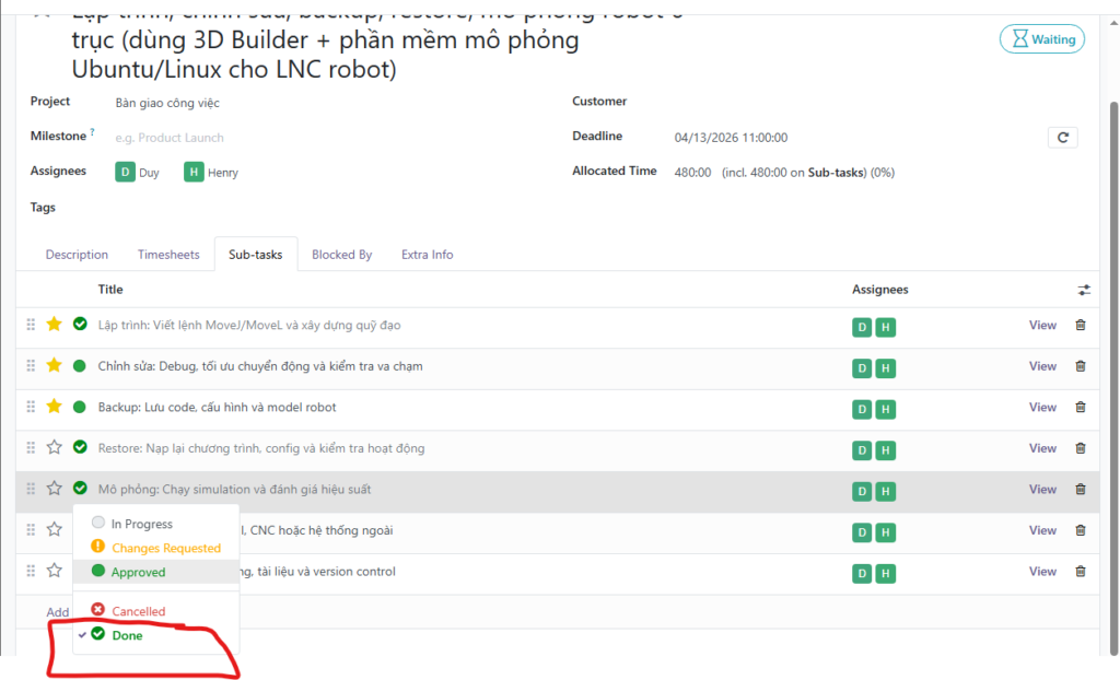 - Cập nhật trạng thái: Khi hoàn thành một sub-task (ví dụ: Viết lệnh robot), hãy chuyển trạng thái sang Done hoặc tick vào biểu tượng hoàn thành.