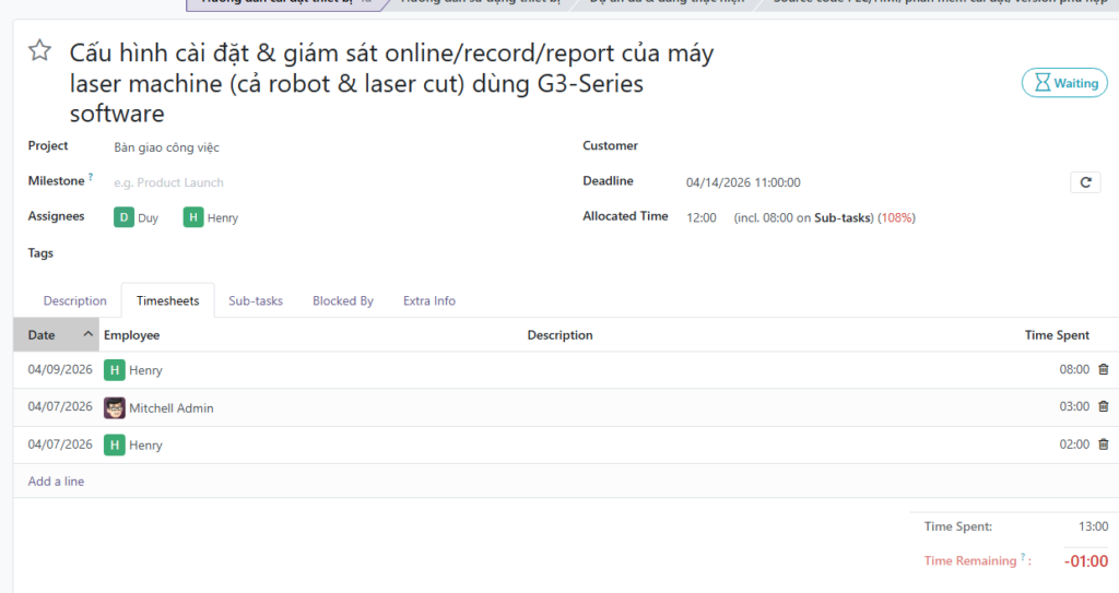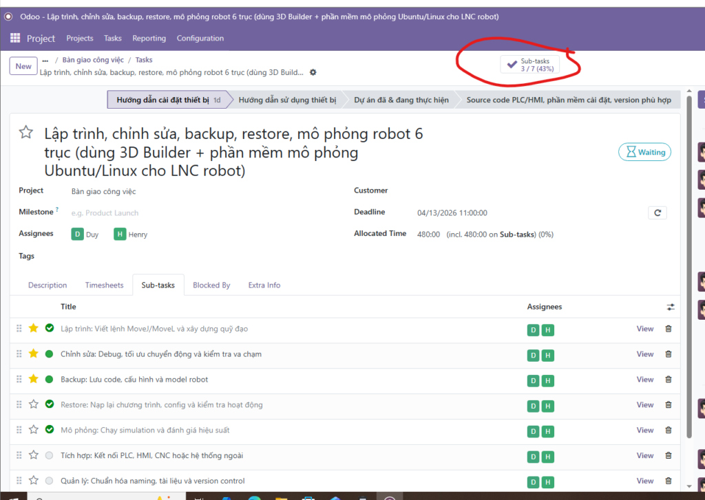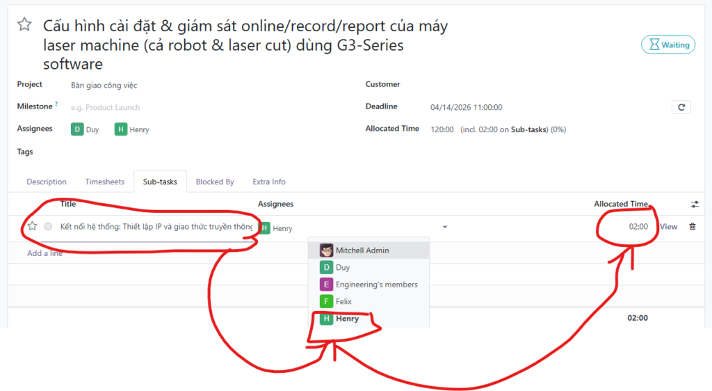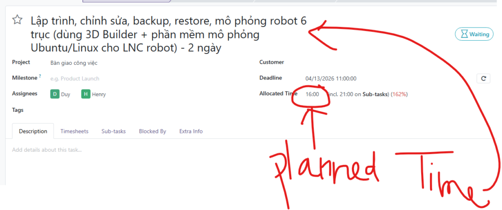 - Lưu ý: Odoo sẽ tự động tổng hợp (roll-up) thời gian từ các sub-task lên task cha để bạn có cái nhìn tổng quan về khối lượng công việc.
