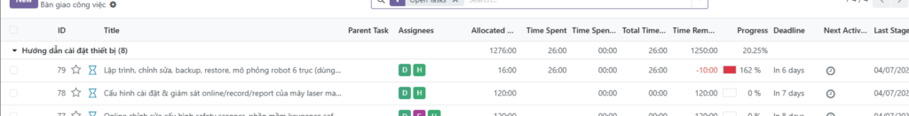 - Ví dụ thực tế: Nếu bạn lập kế hoạch 16 giờ (Allocation) nhưng thực tế làm hết 26 giờ (Timesheet), Odoo sẽ cảnh báo để bạn điều chỉnh nguồn lực hoặc quy trình cho các dự án sau.