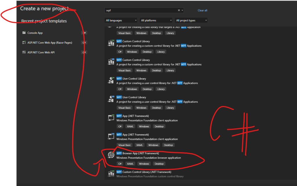 - Chọn đúng dòng WPF App (.NET Framework) với biểu tượng ngôn ngữ C#.