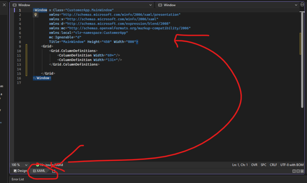 Nếu bạn thấy giao diện XAML báo lỗi đỏ ngay dòng đầu tiên, đó là do thiếu khai báo định danh cho WPF.