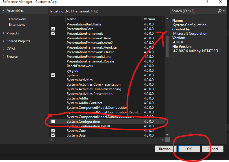 System.Configuration. - Tích chọn vào ô bên cạnh tên thư viện và nhấn OK.