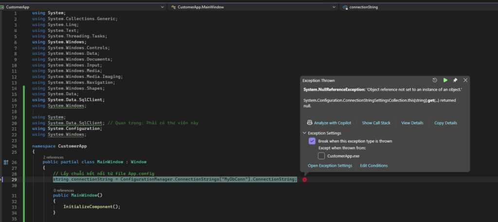 Bạn đã viết code xong, không báo lỗi đỏ, nhưng khi nhấn Start thì ứng dụng bị “văng” và báo lỗi Null tại dòng lấy connectionString. Điều này có nghĩa là Code không tìm thấy tên chuỗi kết nối trong file cấu hình.