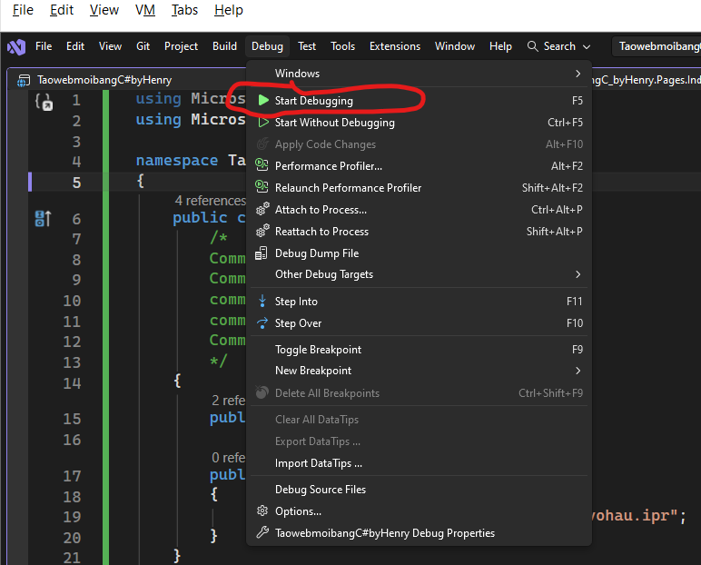2. Vào menu Debug > chọn Start Debugging (hoặc nhấn F5).