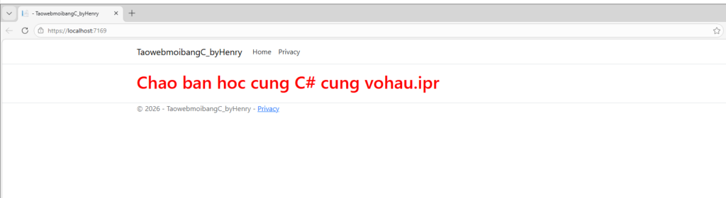 Kết quả: Sau khi Kết nối C# với html, Trình duyệt sẽ khởi động và hiển thị dòng chữ “Chao ban hoc cung C# cung vohau.ipr” với màu đỏ rực rỡ đúng như mong muốn.