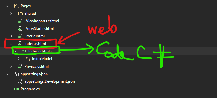 • Index.cshtml.cs (Backend/Code-behind): Nơi viết code C# để xử lý logic, truy vấn cơ sở dữ liệu hoặc tính toán.