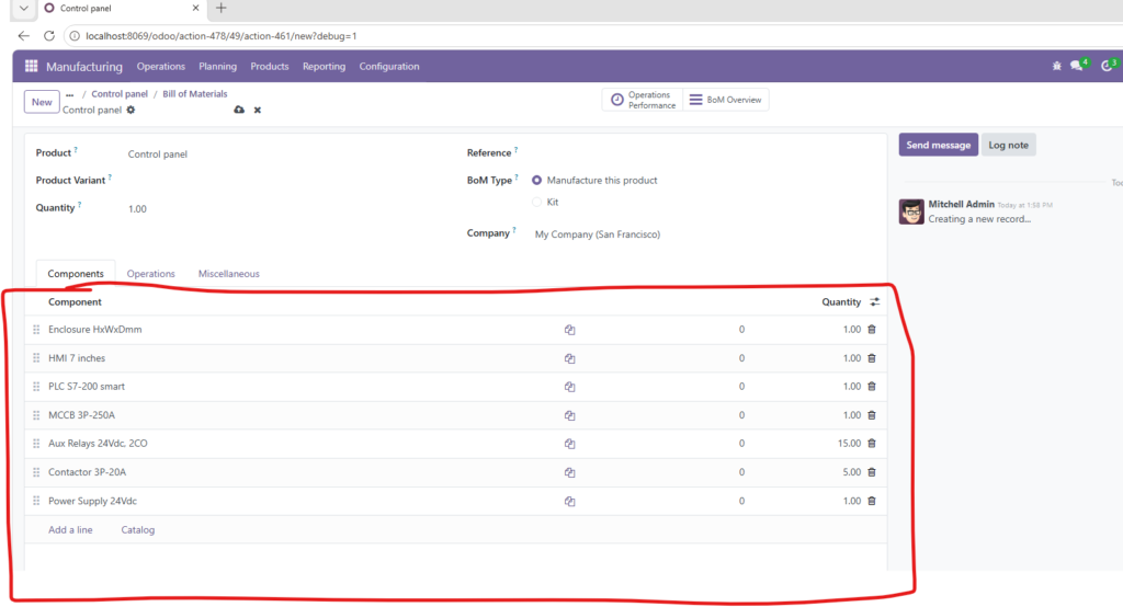 Trong mỗi bản ghi BoM, bạn cần khai báo chi tiết các vật tư tiêu hao. Việc liệt kê chính xác số lượng và chủng loại linh kiện trong tab Components là yếu tố then chốt để Odoo tính toán giá thành và quản lý kho chính xác.