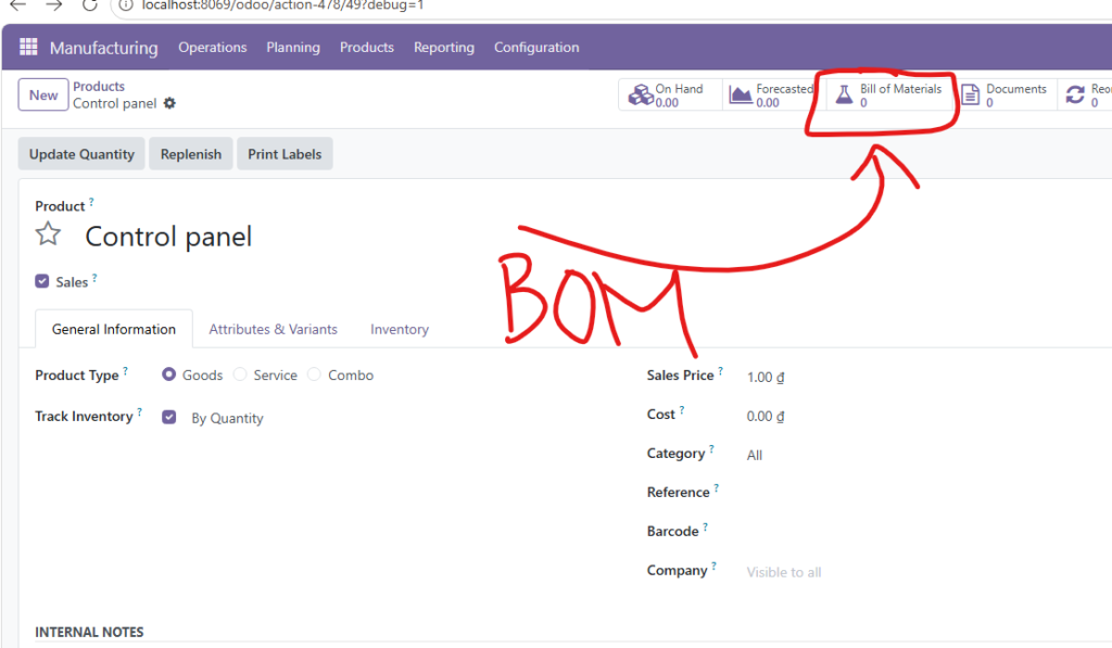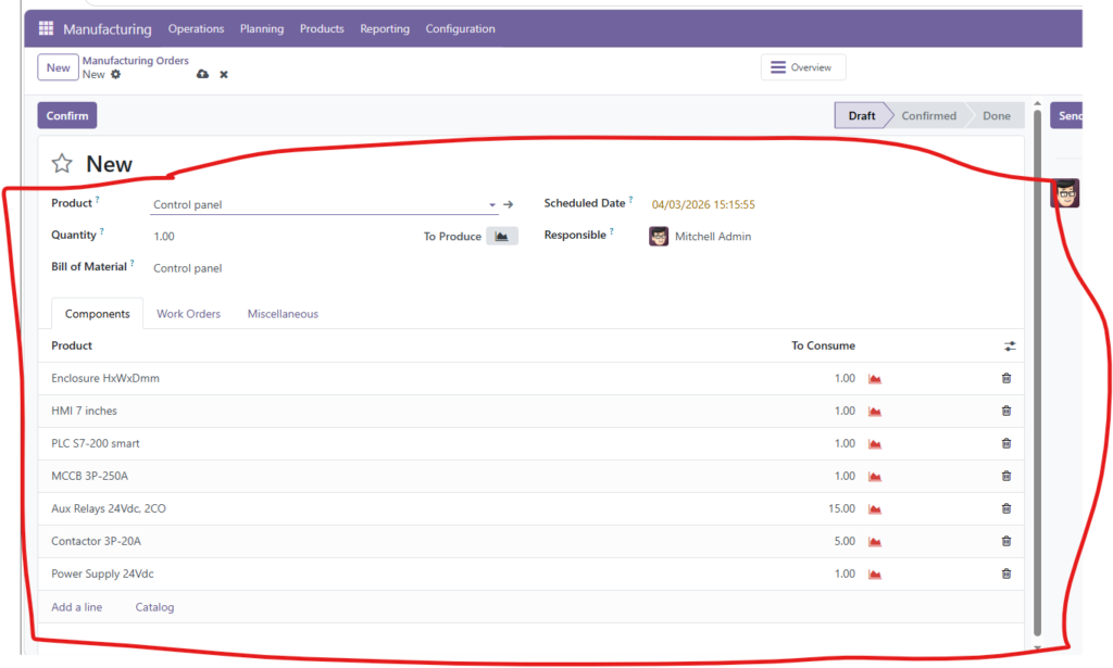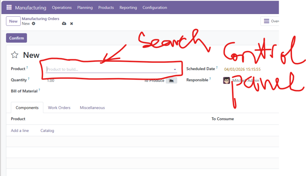 Từ giao diện chính, truy cập vào phân hệ Manufacturing. Tại đây, bạn nhấn nút Create để tạo một MO mới. Hệ thống sẽ yêu cầu bạn xác định sản phẩm cần sản xuất (ví dụ: Control Panel).