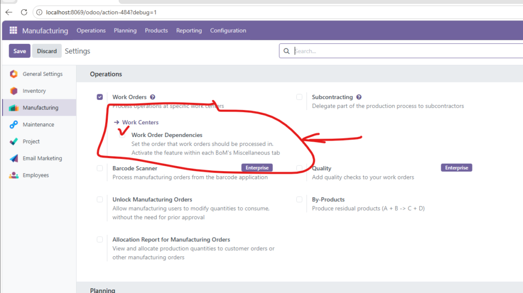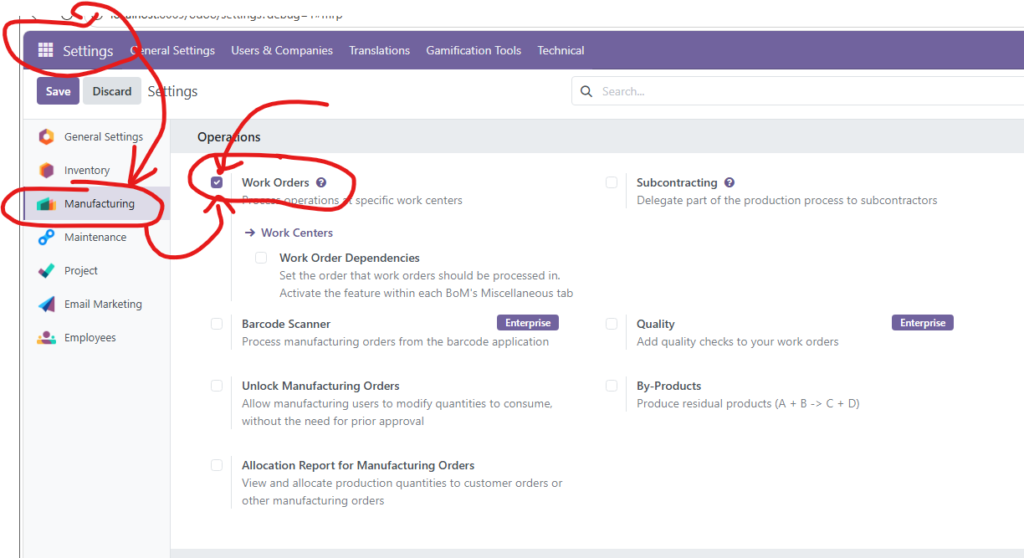 - Truy cập Settings và tích chọn tính năng Work Orders (WO).