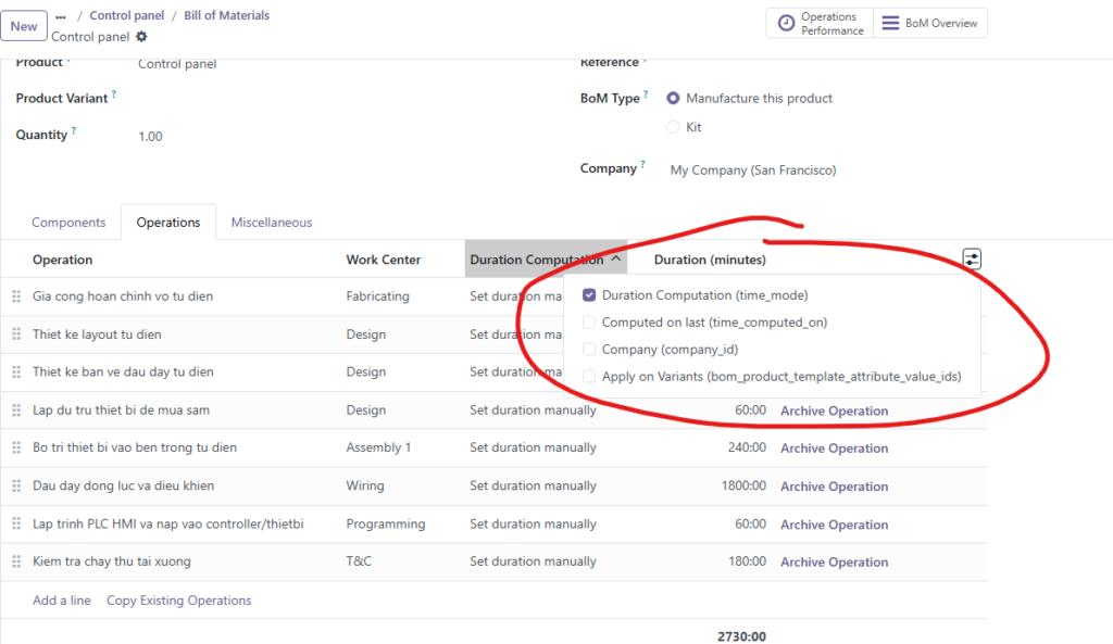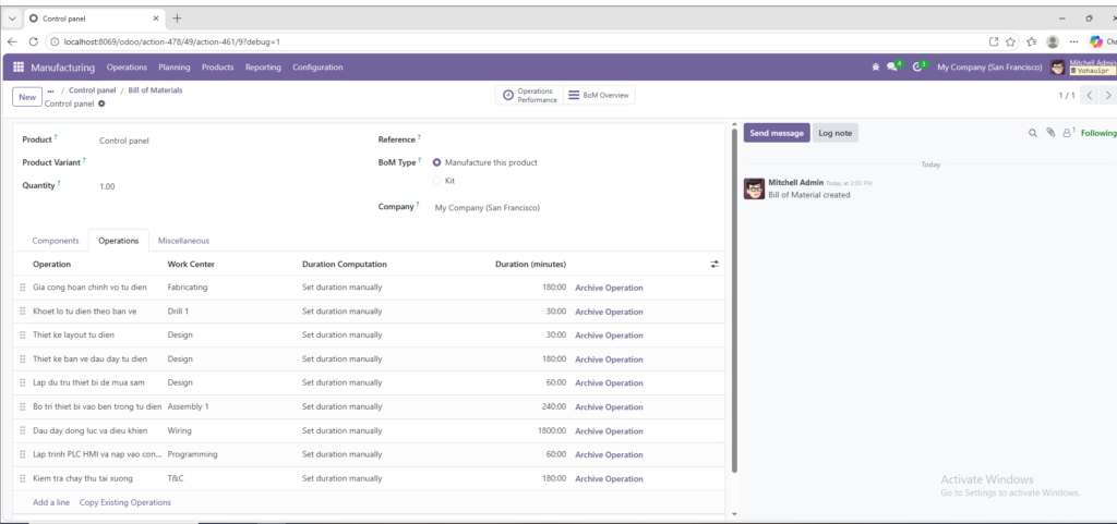 - Sau khi kích hoạt, tab Operations sẽ xuất hiện trong BoM.